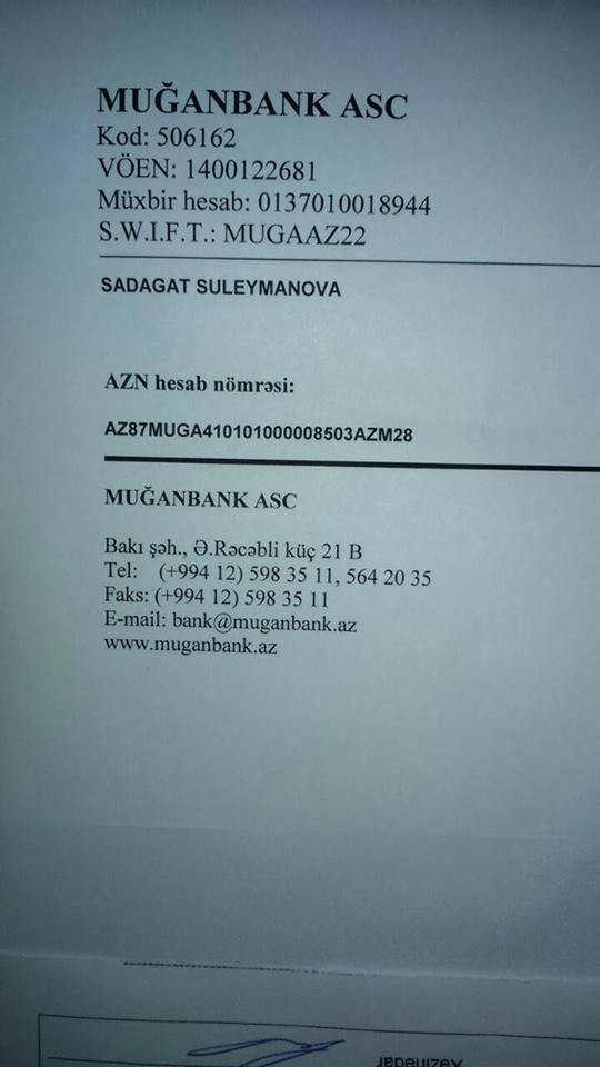 Mümkün yardımı aşağıdakı bank hesabına köçürmə yolu ilə edə bilərsiniz.